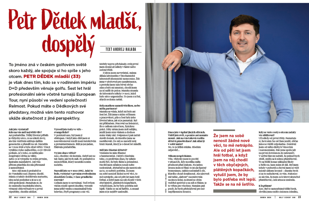 Dubnové vydání Golf Digest C&S nabízí dva výjimečné rozhovory. Interview s golfistou s „nejkrásnějším švihem“, Australanem Adamem Scottem, a také velmi obsáhlý rozhovor vedený na nejrůznější životní, hráčská i profesní témata s Petrem Dědkem mladším, manažerem promotérské společnosti Relmost.