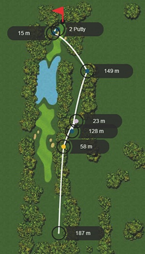 Funkce by se dala jednoduše nazvat jako „Autoshot“. Všechny uvedené modely za vás automaticky zaznamenávají rány na hřišti (kromě puttů) a pamatují si přesnou polohu ran. To už je jen malý krok k tomu, abyste se v klubovně mohli na mobilu, tabletu nebo PC podívat na plánek jamek, kde všechny vaše rány skončily. Je to stejné, jako když sledujete na PGA Tour oblíbeného hráče nebo flight. Nemusíte tedy jen kamarádům barvitě líčit, kde všude jste byli, ale můžete jim to názorně na plánku ukázat. Na obrázku je oblíbená jamka č. 9 v Beřovicích hraná poněkud netradičně po fairwayi jamky č. 5.