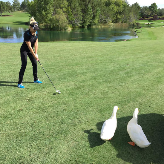 Na golfovou partičku není nikdy pozdě! @jerrytarde Někdy je potřeba zahrát míček před netradičním publikem. @natalie_gulbis Vskutku originální cover... @kevinna915 Welcome drink? @themichellewie A zase to selfí