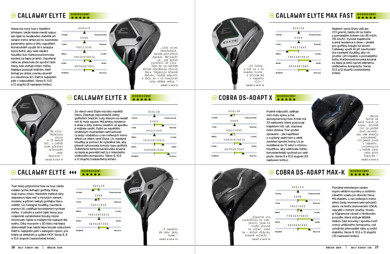 V dalším článku se věnujeme cause potenciálního zániku dvou českých areálů: východočeský Hrádek u Nechanic a západočeský Kynžvart. Národní památkový ústav tato hřiště na svých pozemcích totiž nechce, jejich budoucnost tak nevypadá moc růžově. A pak už je tu nový HOT LIST, tedy přehled 115 nejnovějších driverů, dřev, hybridů, želez, wedgí i putterů, které testovalo a zkoušelo na třicet hráčů a odborníků. Základní motto tohoto velkého přehledu zní: „Nehledáme odpověď na prostou otázku „která nová hůl je nejlepší?“, protože každý pokus o odpověď na tuto otázku by jen vyvolal další otázky. Hledáme spíše hole, které nejlépe sednou vaší hře a vašemu švihu.“